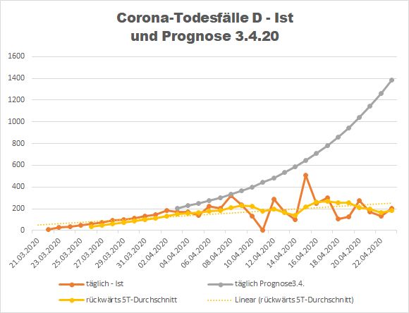 - Wenn das Virus ungebremst sich verbreiten würde, wären heute mindestens in den 5 Monaten 40 Mio. (Hälfte der Bevölkerung) betroffen gewesen, das 40-fache des (maximalen) derzeitigen Status (auch wenn an einigen Hotspots die Quote höher sein wird).. Also wohl mindestens 40 x 9.000 = 360.000 Toten – oder gar mehr, dann wahrscheinlich sogar durch Überlastung der Krankenhäuser mit einer höheren Sterberate als derzeit, wo die Krankenhäuser wohl nur noch in der Größenordnung 10 % auf den Intensivstationen mit COVID zu tun haben – in manchen Regionen auch gar nicht.