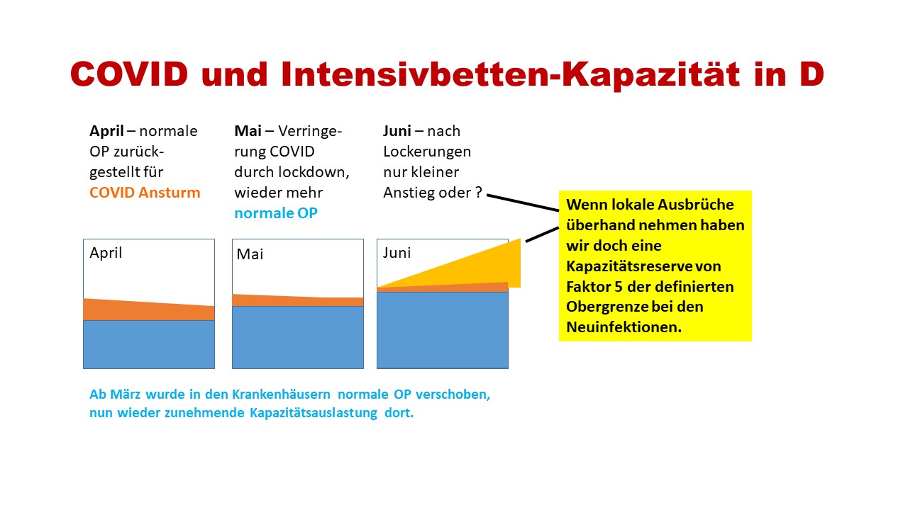 – Wenn die Kapazität für COVID ca. 15.000 Betten beträgt, ist immer noch eine Reserve von 30 %.. Wir haben also m.E. genügend Reserve. Außerdem könnten wieder normale OP aufgeschoben werden. Das wird ja nicht alles über Nacht gehen. Eine Belegung COVID von 15.000 ist das 5-fache der Beanspruchung im April und wohl das 7-fache vom Mai.