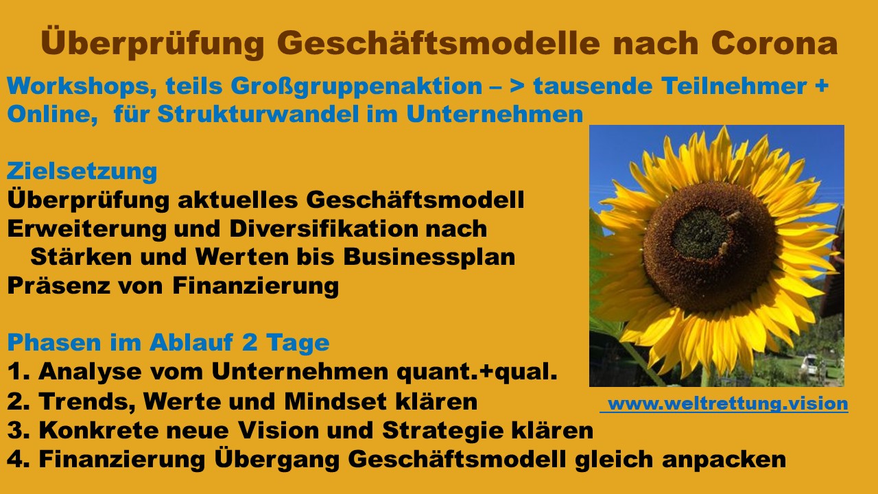 Dazu könnte auch die Aktivierung meiner alten Idee von 1 Mio. Teilnehmer Präsenzaktion 4 Stunden vielleicht 10.000 solcher Workshops mit 100 Teiilnehmern auf Abstand – parallel dazu das noch in Online. Und durchaus echte Zukunftskonferenzen. Wenn sich 60.000 Menschen fanden, die 30 Euro für einen Platz im Olympia-Stadion gebucht haben (der am 12.6.2020 dann nicht stattfinden konnte) – dann müsste das alles doch möglich sein. Es gibt diese Aktivisten und wenn es nur 1 % der Erwachsenen sind bedeutet das: 600.000.