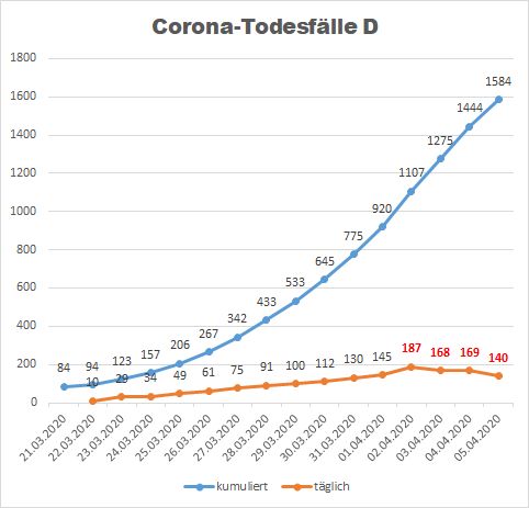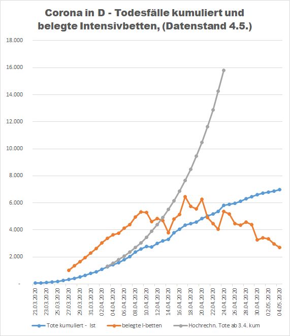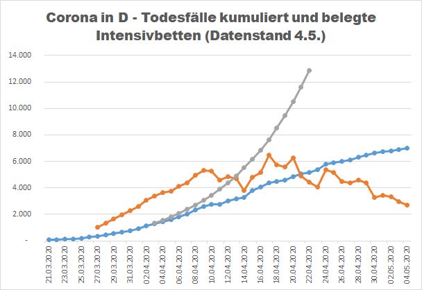 - Wenn das Virus ungebremst sich verbreiten würde, wären heute mindestens in den 5 Monaten 40 Mio. (Hälfte der Bevölkerung) betroffen gewesen, das 40-fache des (maximalen) derzeitigen Status (auch wenn an einigen Hotspots die Quote höher sein wird).. Also wohl mindestens 40 x 9.000 = 360.000 Toten – oder gar mehr, dann wahrscheinlich sogar durch Überlastung der Krankenhäuser mit einer höheren Sterberate als derzeit, wo die Krankenhäuser wohl nur noch in der Größenordnung 10 % auf den Intensivstationen mit COVID zu tun haben – in manchen Regionen auch gar nicht.