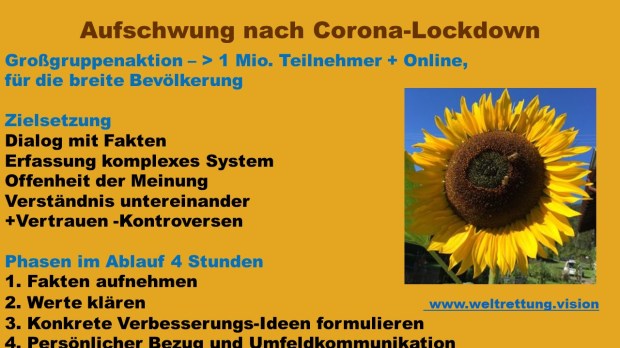 Eine breite Informationskampagne der Regierung(en) müsste dafür die Grundlage legen. Vor 90 Jahren nach der Weltwirtschaftskrise schickte Roosevelt 7.000 Redner los, heute wird das anders gehen. Mit TV und der nachstehenden Großgruppenaktion.